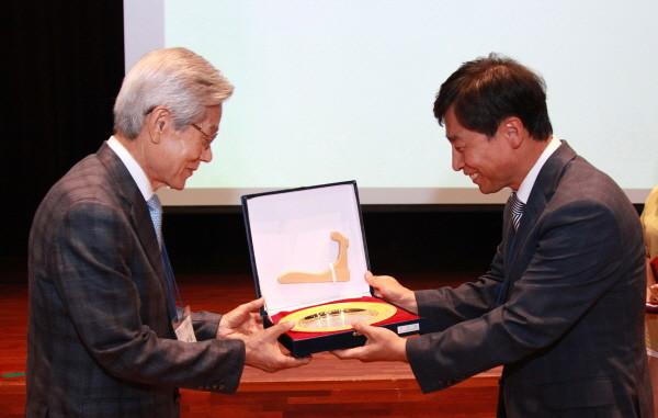 | ▲ 한국식품과학회장 임승택 교수(오른쪽)가 SPC식품생명공학연구소 박정길 소장(왼쪽)에게 상패를 수여하고 있다. | ||