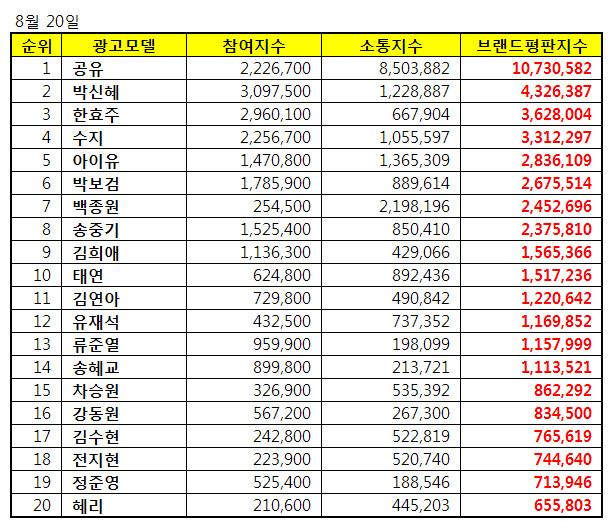 8월 광고모델 브랜드 평판 순위는 공유, 박신혜, 한효주, 수지, 아이유, 박보검, 백종원, 송중기, 김희애, 태연, 김연아, 유재석, 류준열, 송혜교, 차승원, 강동원, 김수현, 전지현, 정준영, 혜리 순이었다.