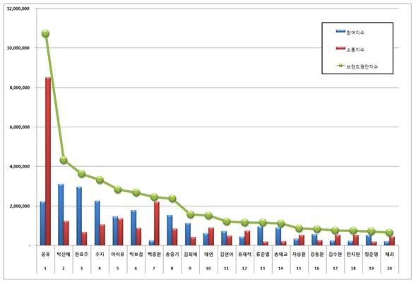 한국기업평판연구소(소장 구창환)는 2016년 7월 19일부터 2016년 8월 20일까지의 광고모델 20명의 브랜드 빅데이터 44,658,814개를 분석해 소비자들의 브랜드 참여와 소통량을 측정했다. 지난 7월 브랜드 빅데이터 45,130,234와 비교해보면 1.04% 줄어들었다.