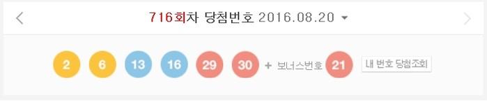 나눔로또가 20일 추첨한 제716회 로또복권 추첨 결과 1등 번호는 '2, 6, 13, 16, 29, 30'다. 2등 보너스 번호는 '21'이다.