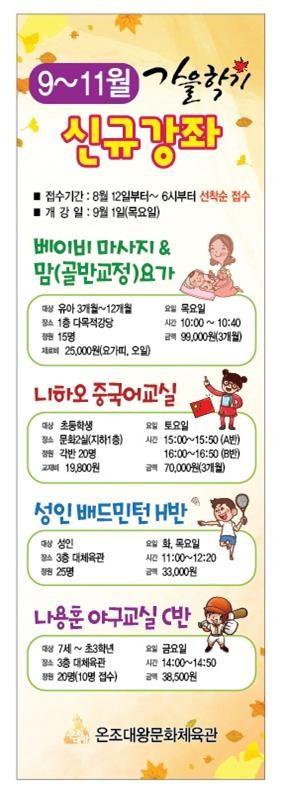 오는 9월1일부터 실시되는 이번 가을학기에는 체육‧문화‧학습강좌 총 10강좌 11개 반이 개편되었으며 다양한 체육 프로그램과 함께 색다른 문화․어학 강좌들이 신설됐다.