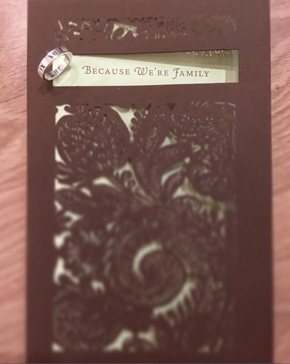사진 속에는 'Because we're family'라는 문구가 적힌 카드와 반지 하나가 담겨 있었다.