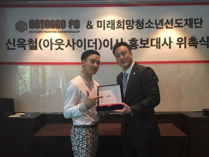 래퍼 아웃사이더가 8일 서울 이비스 앰배서더 강남에서 진행된 종합격투기(MMA)단체 '옥타곤 FC' '미래 희망 청소년 선도재단 홍보대사' 임명식에 참석했다.