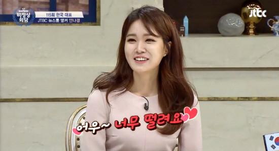 안나경은 12일 JTBC 예능프로그램 ‘비정상회담’에 출연했다. 특히 안나경은 “너무 떨려요 뉴스하는 것보다 백배는 더”라고 수줍게 말했다.