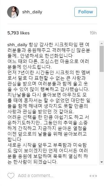 이어 “먼저 7년이란 시간동안 시크릿의 한 멤버로서 말로 다 표현할 수 없는 큰 사랑과 관심을 받으며 여러분들과 함께 울고 웃을 수 있어 많이 행복하고 감사했습니다 지난날들을 다시 돌아보면 아무것도 모를 때에 혼자서는 할 수 없었던 대단한 일들을 함께 해내며 생각지도 못할 만큼의 사랑과 관심을 받았던 것 같아요” 라며 팬들의 사랑에 감사 인사를 전했다.