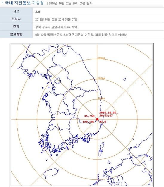 경주 지진은 2일 오후 8시 53분쯤 경북 경주시 남남서쪽 10km 지역에서 일어났다. 규모는 3.0.
