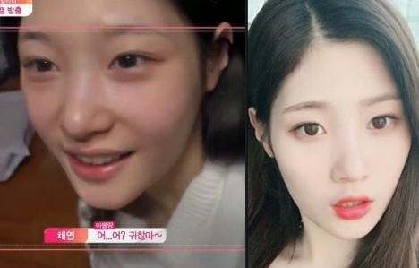 최근 한 온라인 커뮤니티 사이트에 정채연의 메이크업 전과 후 비교사진이 게재된 것.