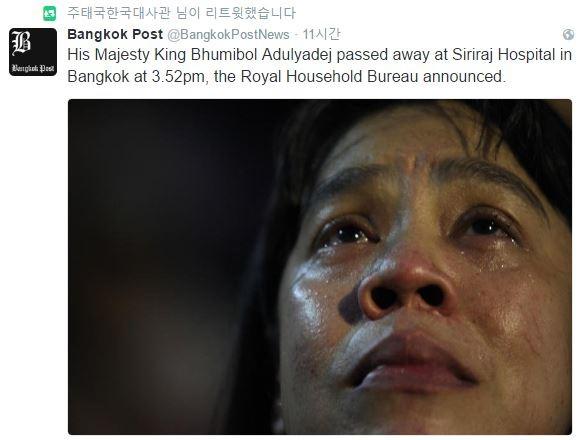 이를 접한 네티즌들은 “유년기를 태국에서 보낸지라 국왕 서거 소식이 남일 같지가 않다. 영화 시작 전에 애국가를 틀 때마다 단골소재로 등장할 만큼 모든 사람들이 존경하고 사랑하는 국왕이었다는 기억이다. 부디 영면하시고 태국의 정치질서가 안정되면 좋겠다”(bakk****), “태국의 국왕이 사망했네. 그들에겐 거의 신적인 존재였는데 앞으로 어떻게 바뀔지”(bmkg****) 등 태국 국민들에게 미쳤던 국왕의 영향력에 대해 언급했다.
