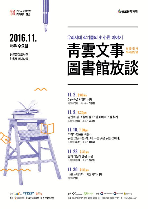 한편 11월부터 2017년 1월까지 청운문학도서관 한옥채 창작실에서는 최영미 시인의 삶이 담긴 ‘시인의 서재’가 운영될 예정이다.