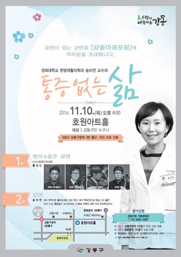 1부에서는 (사)서울튜티앙상블의 현악4중주 공연을, 2부는 강동경희대병원 한방재활의학과 송미연 교수의 ‘통증없는 삶’ 강연으로 진행된다.