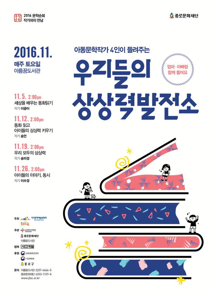 19일에는 ‘어떤 아이가’로 제54회 한국출판 문화상을 수상한 송미경 작가가, 26일에는 이수경 작가가 각각 ‘우리 모두의 상상력’, ‘우리들의 이야기, 동시’라는 주제로 강연을 진행할 예정이다.