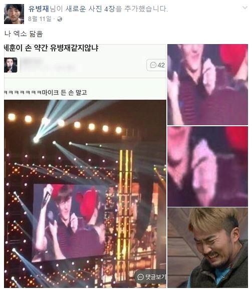 공개된 사진은 한 온라인 커뮤니티에 올라온 것으로, 엑소 세훈의 손 모양이 유병재의 얼굴과 닮았다는 내용을 담고 있다.