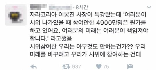 22일 사회관계망서비스(SNS) 등에 따르면 이봉진 사장은 “여러분이 시위에 나가 있을 때 참여 안한 4900만명은 무엇인가를 하고 있다”며 “여러분의 미래는 여러분이 책임져야 한다”고 말했다.