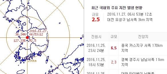 27일 오전 6시 53분께 대전 유성구 남서쪽 3km 지역에서 규모 2.5의 지진이 발생했다.