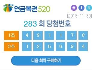 한편 30일 나눔로또가 공개한 제283회차 연금복권520 1등 당첨번호는 '1조491178', '3조125694'이다. 2등 당첨번호는 '1조491177', '1조491179', '3조125693', '3조125695'이다.