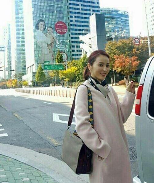 게재된 사진 속 한혜진은 단아함 매력을 물씬 풍긴느 핑크색 코트를 입고 깔끔한 묶음머리를 한 채 브이자 포즈를 취하고 있다.