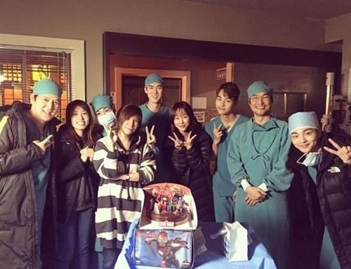 공개된 사진 속 유연석은 '낭만닥터 김사부' 촬영현장서 출연 배우들과 함께 환하게 웃고 있다. 이들은 한석규의 생일을 축하하기 위해 모인 것.