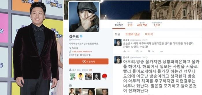 김수로는 9일 본인의 트위터에 "아무리 방송 몰카지만 상황 파악은 해야지. 해외에서 일 보는 사람을 서울로 빨리 들어오게 해서 몰카 짓 하는 건 너무나 도의에 어긋난 방송이라고 생각한다"고 돌직구를 날렸다.