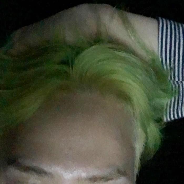 사진 속에는 그의 이마만 드러난 가운데 밝은 연두색으로 염색한 헤어스타일만이 보이고 있다.