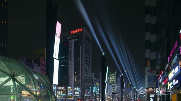| ▲ 강남역 일대의 미디어폴에 설치된 빔라이트가 일제히 하늘을 향해 빛을 쏘아보내고 있다.(사진제공=강남구청) | ||