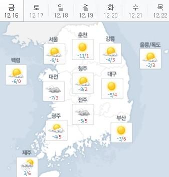 현재 서울 온도는 영하 9도, 대전 영하 8도, 광주 영하 2도, 부산 영하 3도, 춘천 영하 11도를 기록 중이다.