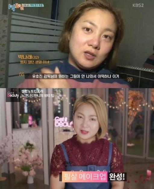 한 네티즌들은 최근 온라인 커뮤니티 사이트에 박나래의 메이크업 전과 후의 모습이 담긴 방송장면을 게시물에 게재했다.