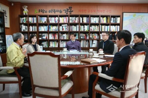| ▲ 이해식 구청장(가운데)가 특별방역대책회의에서 전문가들과 함께 방역대책에 대해 논의하고 있다. | ||
