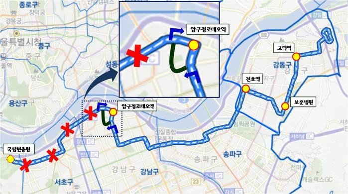 5일 구에 따르면 장거리운행 버스인 351번 버스의 운행거리는 14.1km 단축(압구정로데오역~국립현충원)되며 운행시간은 45분 줄어든다.