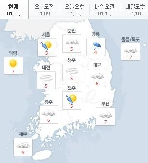 오늘 오전 서울은 1도, 대전3도, 춘천 1도, 대구 4도, 부산 5도, 제주가 8도를 기록 중이다.