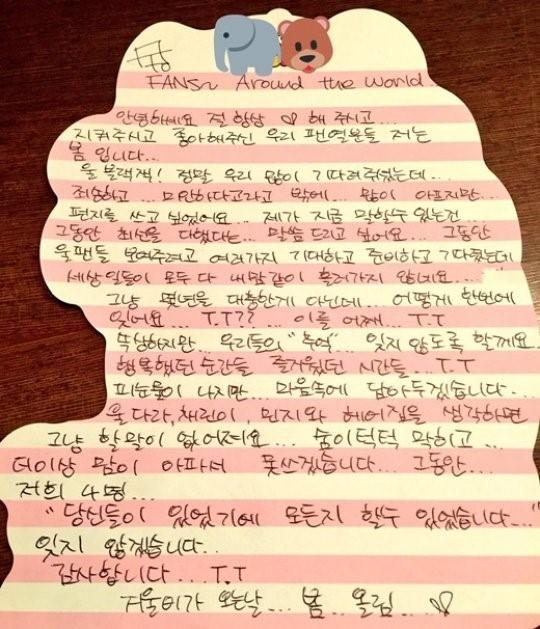 박봄은 지난해 11월 자신의 트위터에 “우리 블랙잭(팬클럽)! 정말 우리 많이 기다려주셨는데 죄송하고 미안하다고라고 밖에…많이 아프지만 편지를 쓰고 싶었어요”라고 시작하는 친필 편지를 공개했다.