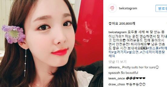 트와이스 공식 인스타그램에는 30일 나연의 사진이 게재됐다. 나연은 사진과 함께 ‘모두들 새해 복 잘 받는 중이신가요?! 저는 운전 연습하면서 잘 지내고 있어요’라는 글귀를 남겼다.