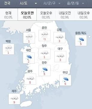 5일 현재 서울은 1도, 춘천은 영하 1도, 대전은 2도, 전주 5도, 부산 6도를 기록 중이다.