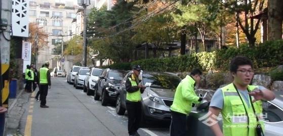 | ▲ 강남구 청담동 발렛주차상습지역을 단속하고있는 구청직원들(사진제공=강남구청) | ||