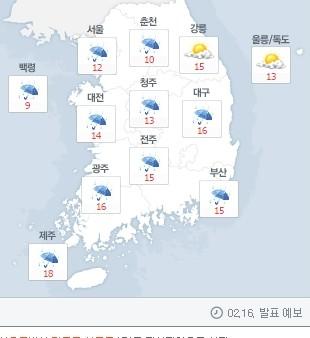 오후에는 서울 12도, 춘천 10도, 대전 14도, 청주 13도, 부산 15도까지 오르고 전국적으로 비가 내린다.