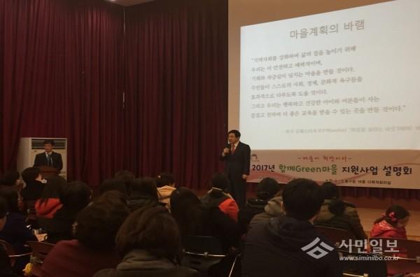 | ▲ 서울 도봉구는 최근 ‘함께Green마을’ 만들기 지원사업 주민설명회를 개최했다. 사진은 주민설명회에서 이동진 구청장이 이야기를 하고 있는 모습.(사진제공=도봉구청) | ||