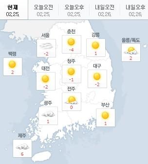 25일 현재 서울은 영하 2도, 춘천은 영하 4도, 강릉은 1도, 대전 영하 2도, 청주 영하 1도, 부산 1도 제주가 6도를 기록 중이다.