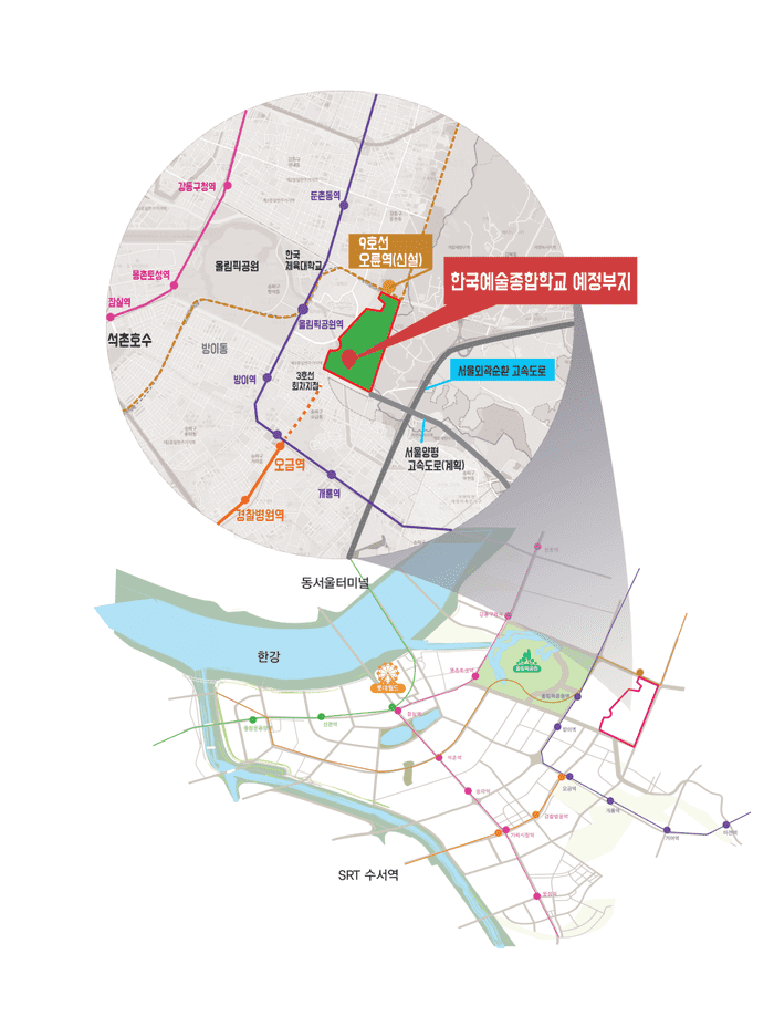 이에따라 구는 한예종 측에 제공할 수 있는 전체 부지 46만㎡ 중 약 15만㎡ 이상에 대해 제반사항 준비를 마쳤다. 대상지는 방이동 소재로 바로 연결되는 지하철 5개 노선(2·3·5·8·9호선)과 SRT(수서역), 고속도로 등 대중교통과 광역교통망이 갖춰져 있다.