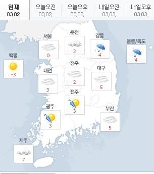현재 서울은 0도, 춘천 2도, 대전 3도, 청주 2도, 대구 5도, 부산 5도를 기록 중이다.