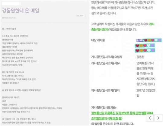 이 네티즌은 자신의 블로그에 강동원 외증조부를 친일파라고 지목한 영화매체 맥스무비의 카드뉴스를 링크로 게시했다. 이후 강동원은 이 이미지 게재를 ‘명예훼손’이라며 네이버에 이 블로그 글을 차단해줄 것을 요청했고, 네이버는 지난달 28일 자체 규정에 따라 게시글을 차단했다.