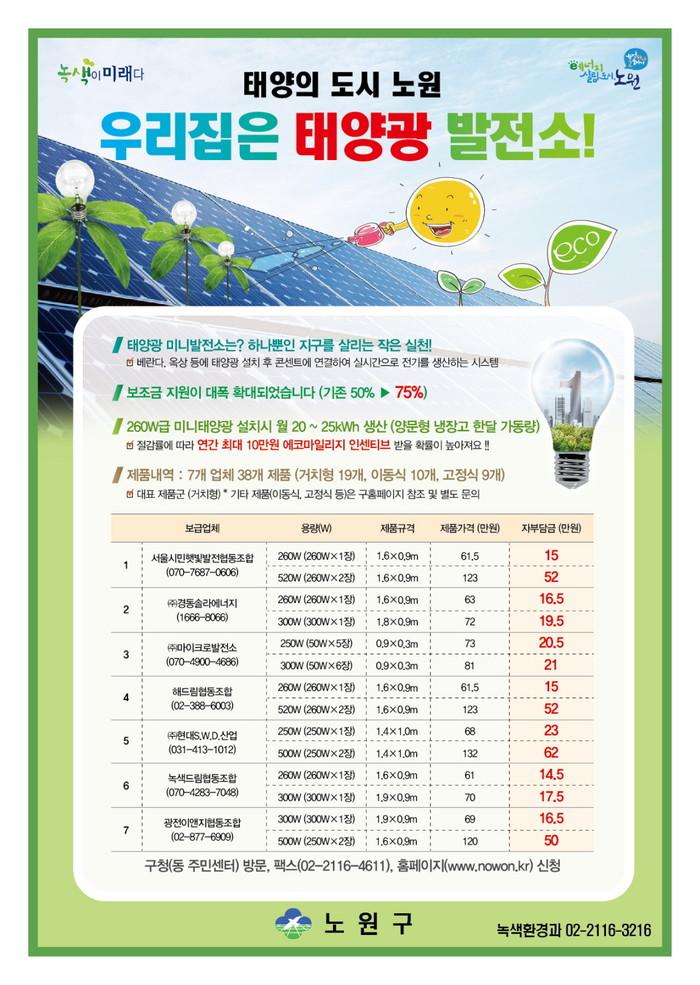[시민일보=이진원 기자] 서울 노원구(구청장 김성환)가 아파트 베란다 등을 활용한 ‘미니 태양광 설치’에 대한 보조금 지원을 강화하기로 하고 신청자를 모집한다고 9일 밝혔다.