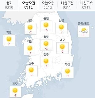 이날 오전 서울은 영하 2도, 춘천 영하 5도, 대전 영하 1도, 부산 3도, 제주 6도를 기록 중이다.