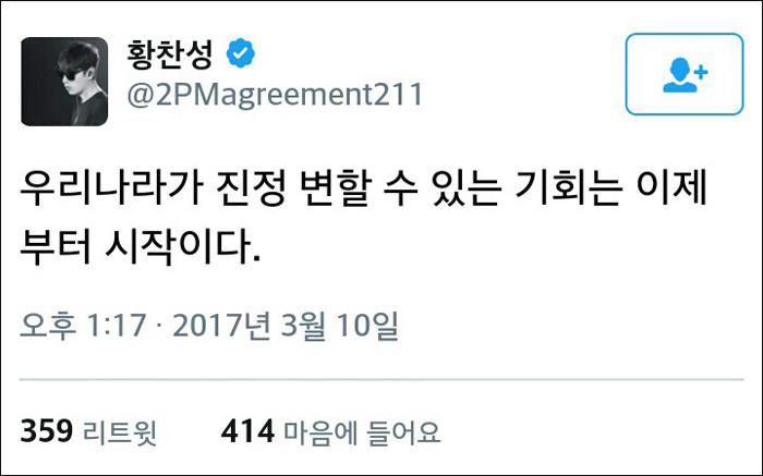 황찬성은 10일 자신의 SNS 트위터에 "우리나라가 진정 변할 수 있는 기회는 이제부터 시작이다"라는 글을 올렸다.