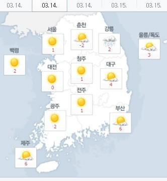 현재 오전 서울은 1도, 춘천 영하 2도, 청주 1도, 대구 4도, 부산 6도, 제주 6도를 기록 중이다.