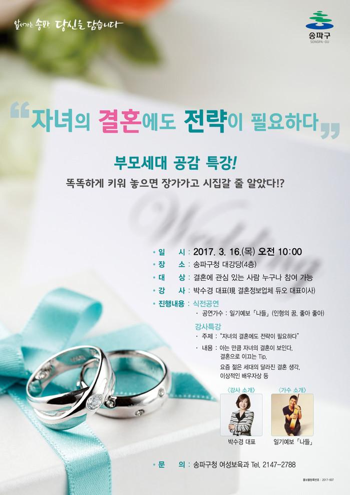 오전 10시부터 열리는 이번 특강은 ‘자녀의 결혼에도 전략이 필요하다’를 주제로 결혼적령기 자녀를 둔 부모세대와 미혼세대 등 결혼에 관심이 있는 구민들을 대상으로 진행된다.