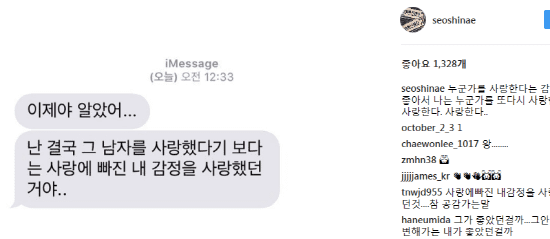 서신애는 자신의 인스타그램을 통해 과거 한 장의 사진을 공개했다. ‘이제야 알았어 난 결국 그 남자를 사랑했다기 보다는 사랑에 빠진 내 감정을 사랑했던거야..’라는 문구가 적혀진 사진은 시선을 사로잡는다.