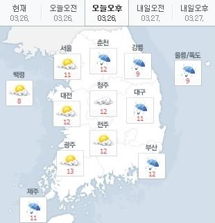 춘천, 강릉, 대구, 부산, 제주 지역에는 비가 올 예정이며 나머지도 흐리겠다. 내일까지 이어지겠으며 기온은 더 낮을 것으로 보인다.