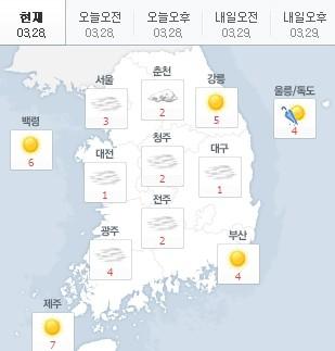 서울은 오전 3도, 춘천 2도, 대전 1도, 청주 2도, 부산 4도, 제주 7도를 기록 중이다.