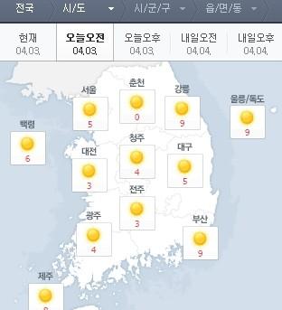서울 5도, 대전 3도, 청주 4도, 강릉 9도, 부산 9도, 제주 8도를 기록 중이다.