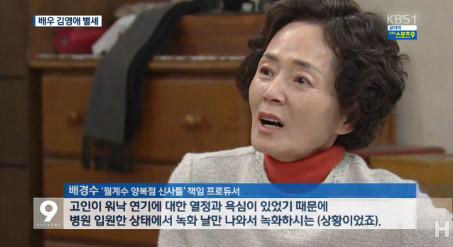 한편 김영애는 KBS2 주말드라마 ‘월계수 양복점 신사들’에 마지막으로 출연하며 마지막 연기 투혼을 발휘한 채 별세했다.