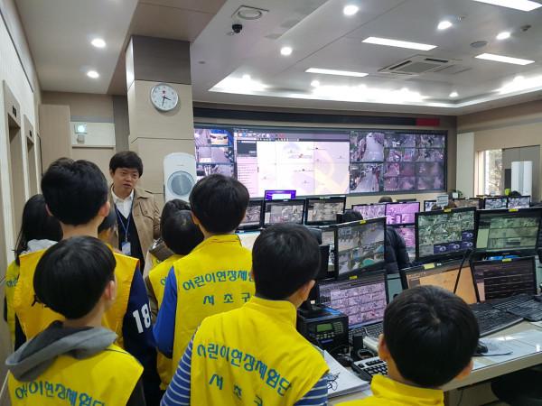 | ▲ ‘서초 25시 센터’ 상황실을 방문해 CCTV로 불법주․․정차를 단속하는 모습을 견학하는 학생들(사진제공= 서초구청) | ||
